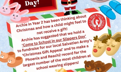 Archie in Year 2 has been thinking hard about Christmas and how a child might feel if they did not receive a gift this year, so Archie has suggested we hold a 'Come to school in your slipper's day' to fundraise for our local Salvation Army's Christmas Gift Appeal and to set a school record for the largest number of children in school wearing slippers!