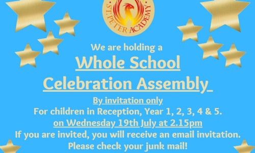 We are holding a 'Whole School Celebration Assembly' for Reception Class, Year 1, 2, 3, 4 and 5 on Wednesday 19th July from 2.15p.m.